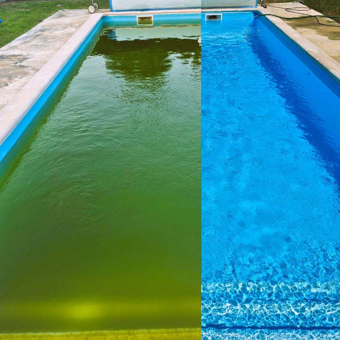 Processo técnico de choque para eliminar algas instaladas, correção do pH, aplicação de produtos profissionais, escovagem das superfícies e clarificação para remover partículas em suspensão. Inclui estabilização final da água.